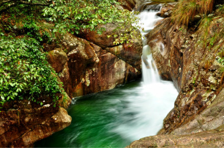 牯牛降雨量充沛,溪流縱橫,溪水常流不斷,潺潺流水,從山頂淙淙而下,遇有石壁斷崖,飛瀉直下形成一道道水瀑,大的如銀河落九天,空谷轟鳴,水汽升騰;小的似白練輕垂,涓涓細(xì)流,如泣如訴。十步一小瀑,百步一大瀑,飛瀑相連,蔚為壯觀。溪流碧綠清澈,時(shí)深時(shí)淺,時(shí)緩時(shí)急,在山間林里穿行,每遇石凼平地,則形成一個(gè)個(gè)大小不一的清潭,晶瑩剔透,異彩紛呈,如同一塊塊翡翠,每至雨季,潭瀑相應(yīng),山色朦朧,如一幅幅墨染的山水圖畫。