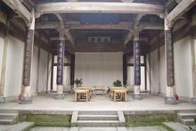 前廳是整幢房子中最精華的部分,大門后面聳立著一幅威儀的中門,在中門“!弊值纳戏剑傆幸环镜瘛鞍僮郁[元宵”圖,圖上雕刻著100個(gè)小男孩過(guò)元宵鬧花燈時(shí)的情景,這正是古代“多子多!眰鹘y(tǒng)觀念的生動(dòng)寫照,“百子鬧元宵”圖兩邊的“商”字斗拱上則分別雕有四出《三國(guó)演義》的戲文,斗拱的上方雕有“南、北”財(cái)神,“南、北”財(cái)神的上方是閣樓護(hù)板,在此,汪定貴設(shè)計(jì)了“漁、樵、耕、讀”四根木雕立柱,分別代表了古代的四種職業(yè)。