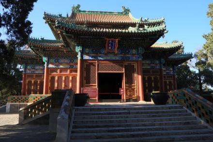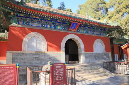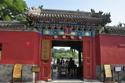 智珠殿,半月城位于瓊島東麓山腳下,座西面東與陟山橋相對(duì),建于乾隆十六年(1751年)。智珠殿建在半月城城臺(tái)上,紅墻綠瓦,四面有五個(gè)牌樓相對(duì),中軸對(duì)稱、布局別致是中國(guó)古建筑中比較少見的,殿內(nèi)原供奉文殊菩薩一尊。