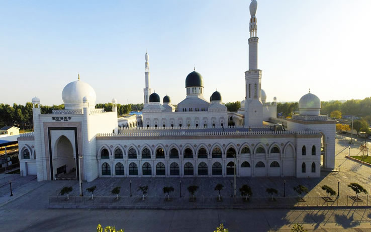 竇店清真寺 2011年8月9日,竇店新建清真寺破土動工,2017年7月1日竣工,并于開齋節(jié)當天正式啟用。 竇店清真寺占地14958平方米,建筑面積12142平方米,能同時容納1500人禮拜。清真寺呈回字形布局,設(shè)有大殿、副殿、講堂、辦公室、接待室、會議室、展室、埋體房、洗浴室、餐廳等,大殿位于正中央,形成“眾星捧月”的建筑風格。