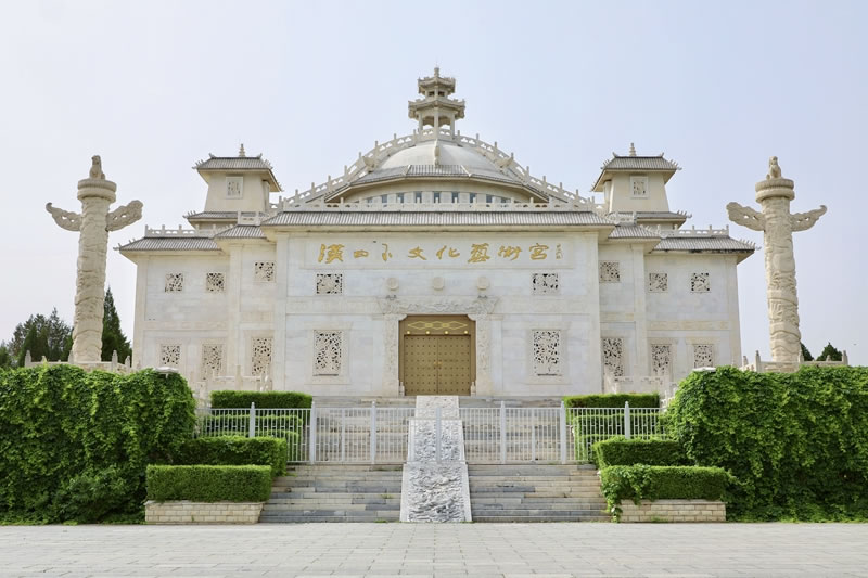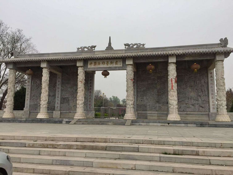 中華石雕藝術(shù)園 大石窩中華石雕藝術(shù)園位于北京市房山區(qū)大石窩鎮(zhèn)。園區(qū)面積2400畝,園區(qū)內(nèi)以石為主。石神、石鼎、石橋、十二生肖各種雕塑均以大理石為原材料,精雕細作而成,充分突出了石雕的藝術(shù)特色,是北京地區(qū)最大的石雕主題公園。漢白玉藝術(shù)宮位于中華石雕藝術(shù)園內(nèi),于2002年2月份動土施工,建筑面積2200平方米。工程的用料全部采用質(zhì)地精良的漢白玉石材,共使用漢白玉石料740多立方米。藝術(shù)宮高27米,最高端是一座棲賢亭,下面是一個半球型的漢白玉天棚,天棚的東、南、西、北、東南、西南、東北、西北方向各有一條漢白玉脊龍,天棚下端是由36根漢白玉側(cè)柱組成的圓柱型建筑,宮門的正上方是長方形的漢白玉牌匾題有雕塑書法大師錢紹武提寫的“漢白玉石雕藝術(shù)宮”。藝術(shù)宮四周的漢白玉角柱、立板共280塊,其中鑲有各種圖案的漢白玉浮雕,在藝術(shù)宮的東西兩側(cè)還開有高4.4米的九龍漢白玉卷拱門。每道門正下方均有一塊好似保和殿前“云龍階石”的御路。