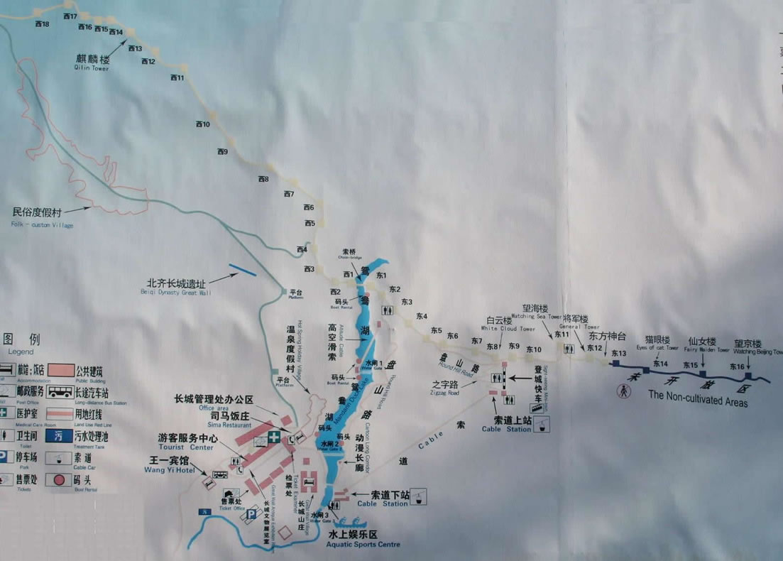 以水庫(kù)為界,以東的部分長(zhǎng)城為東段長(zhǎng)城,以西的部分為西段長(zhǎng)城,徒步登上司馬臺(tái)長(zhǎng)城東段第一個(gè)敵樓東一樓,在山下望司馬臺(tái)長(zhǎng)城,只見它背倚藍(lán)天,橫亙東西,野云悠悠,極高極險(xiǎn)。其山勢(shì)猶如人的手指并攏,呈雙向階梯狀。若從西面登上長(zhǎng)城,側(cè)向看去,唯有一峰在上,仿佛只要奮力爬上,便可居高臨下。但一旦登上第一個(gè)峰頂?shù)臄硺,轉(zhuǎn)身東望,卻又有一峰逼面。當(dāng)?shù)巧系诙䝼(gè)山頭的敵樓,仰頭東望,還有更高一峰在上;而低頭下望,只見第一個(gè)山頭上的敵樓全被掩住,真?zhèn)是“前不見古人,后不見來(lái)者!钡巧系谒膫(gè)敵樓,眼下開闊起來(lái),遠(yuǎn)處的村莊冒著溫馨的炊煙,顯得恬靜、悠然。