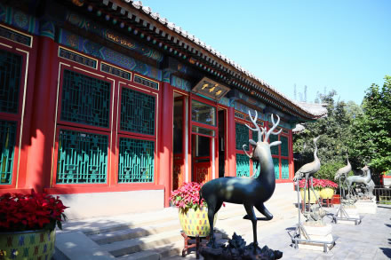 堂前有慈禧乘船的碼頭“樂壽堂”黑底金字橫匾為光緒手書。樂壽堂庭院內陳列著銅鹿、銅鶴和銅花瓶,取意為“六合太平”。院內花卉植有玉蘭、海棠、牡丹等,名花滿院,寓“玉堂富貴”之意。