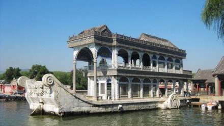 清晏舫俗稱石舫,在長廊西端湖邊,是一條大石船,寓“海清河晏”之意,是頤和園唯一帶有西洋風格的建筑。它的前身是明朝圓靜寺的放生臺。乾隆修清漪園時,改臺為船,更名為“石舫”。石舫長36米,船用大理石雕刻堆砌而成。 船身上建有兩層船樓,船底花磚鋪地,窗戶為彩色玻璃,頂部磚雕裝飾。下雨時,落在船頂?shù)挠晁ㄟ^四角的空心柱子,由船身的四個龍頭口排入湖中。