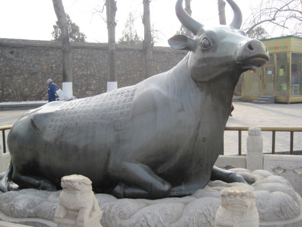 銅牛在昆明湖東岸,十七孔橋東橋頭北側,為鎮(zhèn)壓水患而設。乾隆二十年1755年用銅鑄造,稱為“金!薄