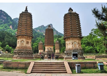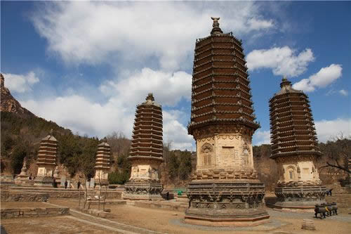 無銘覆缽密檐式塔位于法華禪寺址西南。總高8.8米。塔平面為六角形;、塔身略同前述各塔,但基座束腰處雕有金剛力士像則又不同前述各塔。塔身以上部位有檐三層,均作冰盤檐式,頂作疊澀式。再上依次為覆缽體、塔剎座和相輪,F(xiàn)存塔剎相輪以下部分。