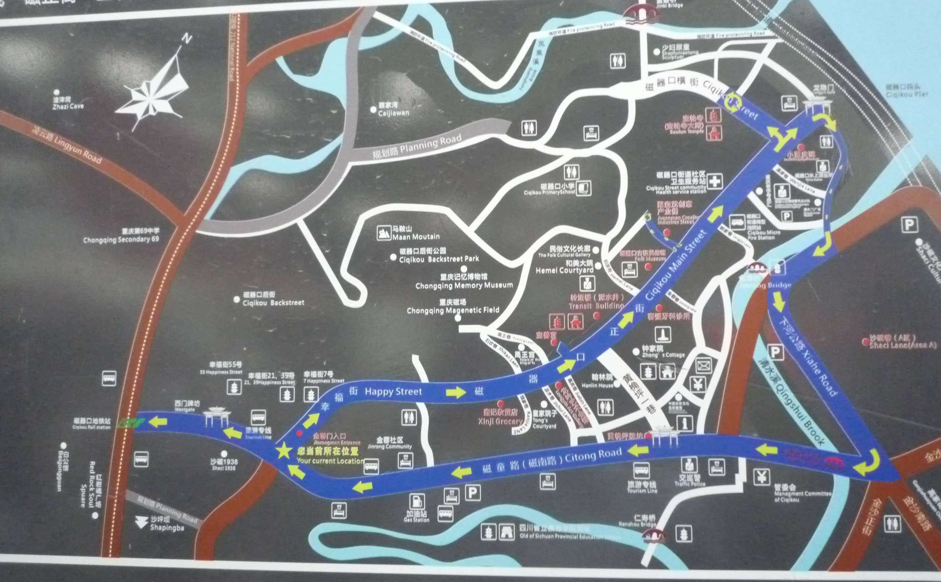 磁器口古鎮(zhèn),原名龍隱鎮(zhèn),位于重慶市沙坪壩區(qū)磁南街1號(hào),沙坪壩區(qū)東北部嘉陵江畔。北距沙坪壩中心5千米,重慶市中心14千米,南距石井坡3千米。磁器口古鎮(zhèn)總面積32.5萬(wàn)平方米,其中保存完好的古鎮(zhèn)核心區(qū)14.3萬(wàn)平方米,分布于馬鞍山東側(cè)和東南側(cè)。古鎮(zhèn)依山而建,由山起城。以磁器口正街和橫街為骨架,42條巷道垂直于正街和橫街向馬鞍山脊和溪溝邊緣呈枝狀發(fā)展,形成特征明顯的樹(shù)枝狀平面格局。正街和橫街寬3—6.5米,將嘉陵江水運(yùn)碼頭、寶輪寺及外圍交通干道聯(lián)為一體。巷道寬1.5—4.5米,順應(yīng)地形靈活布局,不拘一格,街道—巷道—宅院構(gòu)成公共空間、半公共空間、私有空間的3級(jí)空間結(jié)構(gòu),形成清晰的街區(qū)社會(huì)組織的基本模式。