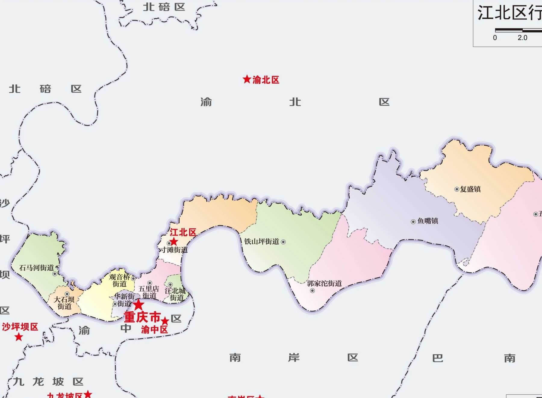街道:華新街街道、江北城街道、石馬河街道、大石壩街道、寸灘街道、觀音橋街道、五里店街道、郭家沱街道、鐵山坪街道