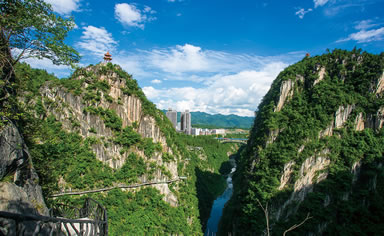 城市大峽谷,因其貫穿黔江老城和舟白、正陽新城三大城市組團,集城市大峽谷、城市大峽江、城市大溶洞于一體,是世界上罕見的“城市峽谷峽江”景觀。城市大峽谷地貌奇特。橫跨七個地質(zhì)年代,兼具喀斯特、礫石、丹霞等地貌特色,峽谷兩岸懸崖絕壁,森林植被茂密,溶洞密布,峽谷長10公里、平均深度200米、垂直落差500米。潺潺流淌的黔江河水穿峽而過,刀砍斧削的峽壁長滿蒼松古樹,如水墨山水畫,峽頂峰巒起伏,松林蔥郁。峽中洞穴密布,洞洞相連,洞中有洞,曲折如同迷宮一般,是大武陵唯一的集峽谷江流、峽谷城市、峽谷體驗、峽谷文化于一體的奇幻景觀。城市大峽谷景致雄壯,有觀音峽、白虎峽、龍脊崗石林等自然景觀,擁有大世界基尼斯之最——高達123米的巨幅摩崖觀音像;有驚險絕倫、垂直高度逾300余米的懸崖絕壁棧道;有奕孝亭、柳孝亭、觀音雕像、摩崖石刻等人文景觀;有回音壁、慈航橋等驚奇美妙的體驗。蜿蜒的峽谷峽江、原始的峽谷風光、濃郁的武陵廟堂在此融為一體。