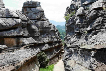 是因?yàn)閹r溶塌陷,石頭斷裂而成的峽谷。石林東部并行排列三個(gè)石峽,分別稱(chēng)為“蓮花峽、鳥(niǎo)鳴峽、聽(tīng)泉峽”。三峽中最引人入勝的當(dāng)數(shù)聽(tīng)泉峽,長(zhǎng)達(dá)300米左右,而寬則在1—2米之間,最深80米左右。站立其中,仰頭觀(guān)望,只見(jiàn)一線(xiàn)藍(lán)天,就像一綹藍(lán)帶飄過(guò)頭頂。兩邊懸崖若削,高聳壁立,氣勢(shì)恢宏。兩面絕壁,均由大小形狀相似、重達(dá)數(shù)十噸的巨石塊組成。石塊間縫隙規(guī)矩,有若人工而成的古城墻一般。無(wú)論什么時(shí)候,都有水滴從巖壁上不停歇地滴落。這時(shí)候,不管外面溫度多高,這里都涼意襲人。