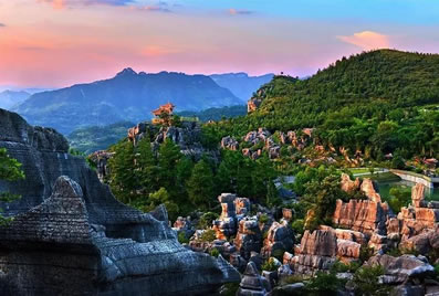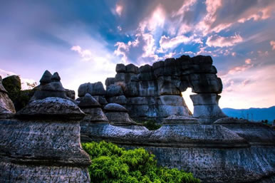 以地表石林為代表的典型的喀斯特地貌景觀(guān)十分吸引人。該類(lèi)景觀(guān)表面呈虎皮狀,形成一系列各不相同的觀(guān)賞景點(diǎn)。在這里,群峰壁立,奇峰危石,可謂千姿百態(tài),石門(mén)、石寨、石柱等,酷似人工堆疊,卻無(wú)人工痕 跡;飛禽走獸的石頭,栩栩如生、惟妙惟肖;田園阡陌、炊煙裊裊,清泉碧池、懸崖雪瀑,白鶴青 、 碧空鳥(niǎo)語(yǔ),清麗若未施粉黛的閨秀楚楚動(dòng)人。其主要景觀(guān)有情朗峰、香爐山、巨扇、地縫一線(xiàn)天、化石 、石鼓、將軍石等數(shù)十處。顯示出萬(wàn)盛石林景觀(guān)的美感與靈性。