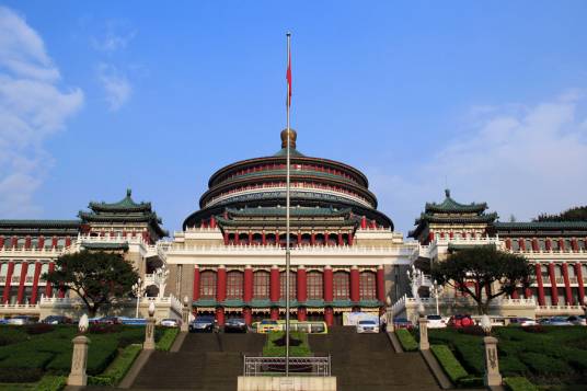 重慶市人民大禮堂,位于重慶市渝中區(qū)人民路173號(hào),于1951年6月破土興建,1954年4月竣工,是一座仿古民族建筑群,是重慶十大文化符號(hào),是中國(guó)傳統(tǒng)宮殿建筑風(fēng)格與西方建筑的大跨度結(jié)構(gòu)巧妙結(jié)合的杰作,也是重慶的標(biāo)志建筑物之一。