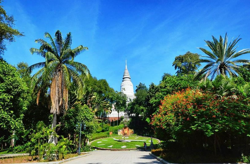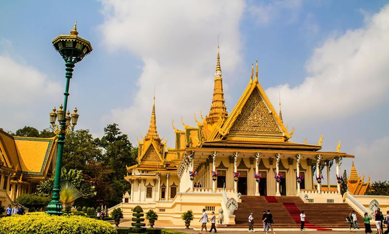 金邊王宮 金邊王宮(RoyalPalace)也稱(chēng)四臂灣大王宮,因位于上湄公河、洞里薩河、下湄公河與巴薩河的交匯處而得名,是諾羅敦國(guó)王于1866—1870年建造的。王宮為長(zhǎng)方形,長(zhǎng)435米,寬402米,外有城墻。王宮的建筑具有高棉傳統(tǒng)建筑風(fēng)格和宗教色彩,宮殿均有尖塔,代表繁榮;殿身涂以黃、白兩色,黃色代表佛教,白色代表婆羅門(mén)教。王宮最初為木結(jié)構(gòu),后改建為水泥結(jié)構(gòu),但保持了原來(lái)的風(fēng)貌。王宮內(nèi)主要建筑有:銀閣、金鑾殿、波佳尼閣、凱瑪靈宮、月光樓。