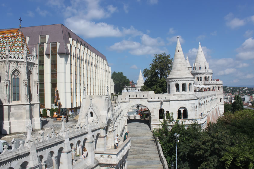 漁人堡 漁人堡(Halászbástya)是一個(gè)新哥特式和新羅曼風(fēng)格的觀景臺(tái),位于匈牙利首都布達(dá)佩斯布達(dá)一側(cè)多瑙河河畔的城堡山,鄰近馬加什教堂。它修建于1895年到1902年之間,設(shè)計(jì)師是弗里杰·舒勒克(Frigyes Schulek)。第二次世界大戰(zhàn)期間,漁人堡近乎毀滅。1947年至1948年之間,弗里杰·舒勒克的兒子亞諾什·舒勒克負(fù)責(zé)了修復(fù)工程。 如今,城堡的一部分作為餐廳使用。回廊里有絕佳的觀景角度,而瑪加什教堂與漁人城堡間的銅像,則是第一位匈牙利國(guó)圣·伊斯特萬(wàn)一世,圣·史迪分國(guó)王雕像(King St. Stephen’s statue)圣·史迪分國(guó)王是匈牙利第一個(gè)天主教國(guó)王(公元1000年加冕),同時(shí)也可以說(shuō)是匈牙利國(guó)的建立者。漁人堡旁的希爾頓旅館,外層是茶色的帷幕玻璃映照著漁人堡和一旁的教堂倒影,美麗而迷人。 從塔和觀景臺(tái),可以看到多瑙河、瑪格麗特島、東面的佩斯,以及蓋勒特丘陵(Gellért Hill)的全景。