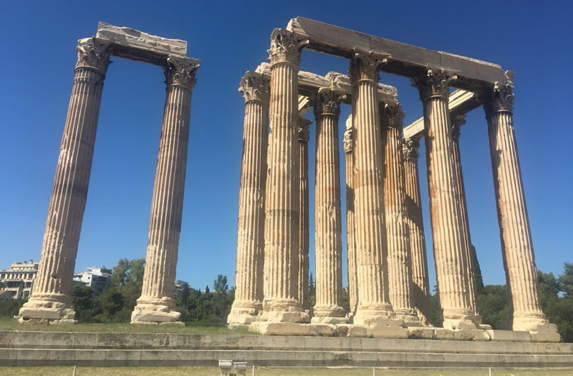 宙斯神廟 宙斯神廟位于希臘雅典衛(wèi)城東南面,是為了祭祀宙斯而建的,也是古希臘最大的神廟。宙斯神廟建于公元前470年,于公元前456年完工,由建筑師Libon設(shè)計(jì),宙斯神像則由雕刻家菲狄亞斯負(fù)責(zé)。直到公元前86年,羅馬指揮官蘇拉(Sulla)攻占雅典,破壞了尚未完成的建筑,將一部分石柱和其他建材拆下來(lái)之后,運(yùn)到羅馬。直到今天,在羅馬市中心的古羅馬廣場(chǎng)遺址上,還能看見(jiàn)它們。宙斯廟尤以象牙和黃金的塑像而聞名于世。 宙斯神廟是伊奧尼亞風(fēng)格的建筑,后來(lái)改用了科林斯式石柱風(fēng)格,而且一概使用大理石。整個(gè)建筑坐落在一塊205米長(zhǎng),130米寬的地基上,神廟本身長(zhǎng)107.75米,寬41米,共有104根科林斯柱。每根石柱高達(dá)17.25米,頂端直徑達(dá)1.3米,約計(jì)用大理石1.55萬(wàn)噸。和眾多的古希臘神廟一樣,宙斯神廟也遭受?chē)?yán)重的破壞,104根柱子中僅存13根。宙斯神廟和哈德良拱門(mén)隔路相望,宙斯神廟位于路南,而哈德良拱門(mén)則位于路北,這兩座建筑都是由距今1900多年前的羅馬帝國(guó)國(guó)王哈德良時(shí)期修建的。我們已經(jīng)無(wú)法看到宙斯神廟和哈德良拱門(mén)的原始形態(tài),只能通過(guò)斷壁殘?jiān)珌?lái)回憶當(dāng)時(shí)的輝煌。