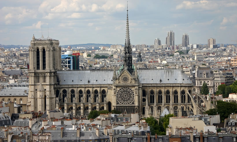 巴黎圣母院 巴黎圣母院(法語:Cathédrale Notre Dame de Paris),又名巴黎圣母主教座堂、巴黎圣母院大教堂,位于法蘭西共和國首都巴黎市中心城區(qū),地處塞納河中央西堤島上,與巴黎市政廳和盧浮宮隔河相望,為哥特式基督教教堂建筑;始建于1163年3月24日(羅馬教皇亞歷山大三世四年),是基督教支派天主教巴黎總教區(qū)主教座堂、法國首都最悠久和最具象征意義的紀(jì)念碑之一、歐洲最著名的哥特式大教堂之一、法國最具代表性的文物古跡和世界遺產(chǎn)之一,法國及歐洲文學(xué)文化地標(biāo)建筑。 巴黎圣母院平面為長形馬蹄哥特式拉丁十字形制,總長約127米,總寬約48米,總高達(dá)96米,總建筑面積達(dá)5500平方米,總占地面積達(dá)6000平方米;西立面置有兩座鐘塔,高約69米;內(nèi)部共有五個縱艙,包括一個中艙與兩側(cè)各兩個的翼艙,十字的頂部是祭壇,十字長翼是圣母院長方形主殿;東端是圣壇,后為半圓形的外墻,橫廳兩個盡段都有開門,旁置小塔;圣壇外有標(biāo)志性尖塔,高96米。巴黎圣母院是世界上第一座完全意義上的哥特式教堂,建筑本體的雕刻藝術(shù)和繪畫藝術(shù)及堂內(nèi)珍藏的大量藝術(shù)珍品具有極高的歷史文化價值和蜚聲中外的世界聲譽(yù),是法國巴黎的象征,世界主流宗教基督教圣地。