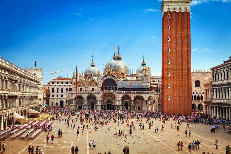 圣馬可廣場 圣馬可廣場(Piazza San Marco) ,官方標準譯名圣馬爾谷廣場,又稱威尼斯中心廣場,一直是威尼斯的政治、宗教和傳統(tǒng)節(jié)日的公共活動中心。圣馬可廣場是由公爵府、圣馬可大教堂、圣馬可鐘樓、新、舊行政官邸大樓、連接兩大樓的拿破侖翼大樓、圣馬可大教堂的四角形鐘樓和圣馬可圖書館等建筑和威尼斯大運河所圍成的長方形廣場,長約170米,東邊寬約80米,西側(cè)寬約55米。廣場四周的建筑從中世紀到文藝復興時代都有。 圣馬可廣場初建于9世紀,當時只是圣馬可大教堂前的一座小廣場。馬可是圣經(jīng)中《馬可福音》的作者,威尼斯人將他奉為守護神。相傳828年兩個威尼斯商人從埃及亞歷山大將耶穌圣徒馬可的遺骨偷運到威尼斯,并在同一年為圣馬可興建教堂,教堂內(nèi)有圣馬可的陵墓,大教堂以圣馬可的名字命名,大教堂前的廣場也因此得名“圣馬可廣場”。