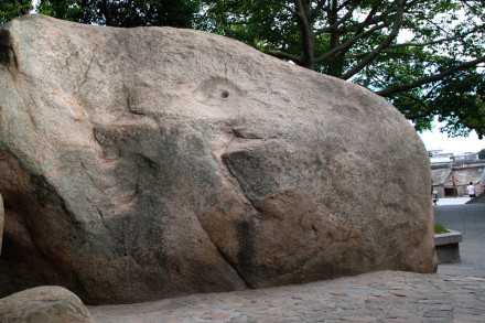 人們常說(shuō),到了閩南,不到東山,是一件憾事;而到了東山,不到風(fēng)動(dòng)石,則更是一大憾事。的確如此。 風(fēng)動(dòng)巨石聳立在陡崖上,高4.37米,寬4.47米,長(zhǎng)4.46米,重約200噸,上尖底圓,狀似仙桃,巍然“擱”在一塊臥地凸起且向海傾斜的磐石上,兩石的接觸面僅為十余平方厘米?耧L(fēng)吹來(lái)時(shí),巨石輕輕搖晃不定,人若仰臥盤石上,蹺起雙足蹬推,巨石也搖晃起來(lái),但又不會(huì)倒下。人們站在風(fēng)動(dòng)石下面,有一種驚險(xiǎn)的感覺,嘆為天下奇觀,故名“風(fēng)動(dòng)石”,詩(shī)曰:“風(fēng)吹一石萬(wàn)鈞動(dòng)”。東山風(fēng)動(dòng)石因其“奇、險(xiǎn)、大” 的特點(diǎn)而被載入《中國(guó)地理之最》,譽(yù)為“天下第一奇石”。