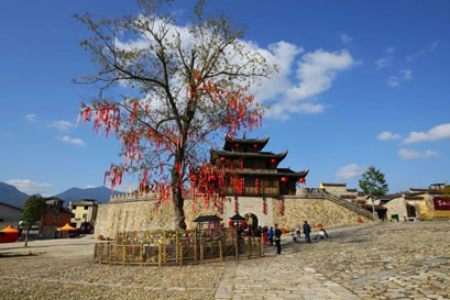 和平古鎮(zhèn)現(xiàn)存東北兩座譙樓。東門(mén)譙樓是三重檐歇山式,而其他三座譙均是兩重檐的。東門(mén)譙樓,門(mén)洞用石條砌成,墻體用大塊的卵石筑成。城墻腳下的這塊“禁止搬運(yùn)、保固地方”的石頭,是和平“舊市三禁碑”之一,為清代設(shè)立。由于當(dāng)時(shí)社會(huì)地主少、農(nóng)民多,農(nóng)民每次把收成的大部分上交給地主,在青黃不接的時(shí)候,糧價(jià)上漲,地主就把大部分的糧食外運(yùn)到邵武城關(guān)或福州,造成產(chǎn)糧地變?yōu)槿奔Z地,農(nóng)民面臨饑餓的威脅,因而設(shè)此碑,并輪流放哨,規(guī)定所有私自外運(yùn)的糧食都必須沒(méi)收或低價(jià)收購(gòu),因而它起到維護(hù)當(dāng)時(shí)的糧食市場(chǎng)的作用。北門(mén)譙樓,當(dāng)?shù)厝朔Q(chēng)“武陽(yáng)樓”,因它對(duì)面的山叫武陽(yáng)山,清同治年間翻修過(guò)。城門(mén)的門(mén)洞用條石砌成,比東門(mén)門(mén)洞高大。城門(mén)兩邊各保留了一段用鵝卵石筑成的明城墻,鵝卵石上長(zhǎng)滿(mǎn)青苔,漫漶的縫隙間長(zhǎng)著青青野草,四季皆有野花開(kāi)放,充滿(mǎn)了詩(shī)情畫(huà)意。風(fēng)雨譙樓,見(jiàn)證百年夕陽(yáng)煙雨;古樸城門(mén),迎送多少古鎮(zhèn)喜憂。譙樓走過(guò)的是悠悠歲月,形容雖然殘破斑駁,留下的卻是耐人尋味的古鎮(zhèn)歷史。
