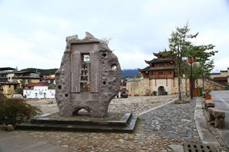 東門(mén)街兩旁老房子擠擠挨挨,多為磚木結(jié)構(gòu)。街面鋪設(shè)石板,塊塊光滑,雨后更是光潔如鏡,如詩(shī)如畫(huà)。詩(shī)云:“江南冷雨北吹斜,人影百姿映在街。潔石鏡明非打銼,但憑千載萬(wàn)家鞋!苯置婷扛100米就有一個(gè)用條石鋪成,狀似棋盤(pán)的圖案,當(dāng)?shù)厝朔Q(chēng)其為棋盤(pán)石。棋盤(pán)石有何作用呢?傳統(tǒng)的說(shuō)法是:和平歷代都有大量的人士中科舉或在外做官,他們衣錦還鄉(xiāng),榮宗耀祖,騎馬或坐轎回來(lái),進(jìn)入城堡,每到一塊棋盤(pán)石就停住,下馬或下轎稍停片刻,以顯示他的榮耀和光彩。還有一個(gè)作用是:有一定身分或地位的人家出殯,棺木每抬到一處棋盤(pán)石就停下來(lái),讓孝子賢孫們跪下叩拜,拜完再抬起棺木往前走。一般沒(méi)有官職或身分地位的人家則沒(méi)有在這里停棺叩拜的資格。