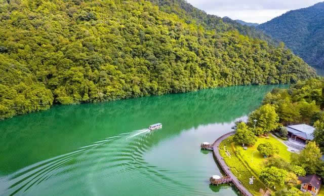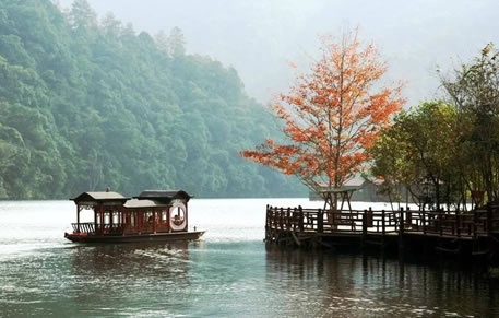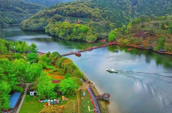 景區(qū)中的水域長達七公里,清澈的水流,色彩斑斕的山林倒影,構成生機勃勃的山水畫卷,使人有“舟行碧波上,人在畫中游”的親切感受。這里是各種野生動植物的聚集地,有各種奇花異草和珍禽走獸。每年年底到次年的初夏,總有一大群鴛鴦飛臨此地,在這水質(zhì)清純、環(huán)境優(yōu)美的地方過冬,為景區(qū)增添了愛的溫馨,傳播愛的信息。