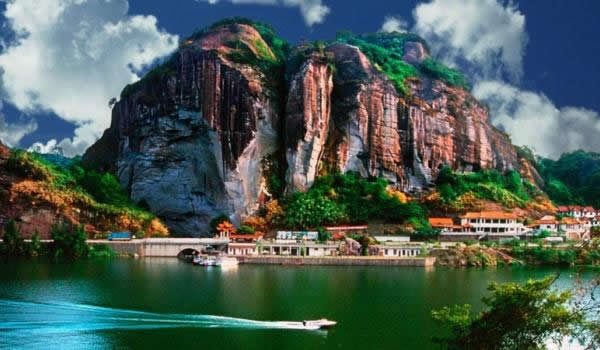 桃源洞因盛產(chǎn)栟櫚樹,古有栟櫚山之稱。風景區(qū)起始于唐代,五代后晉年間建有寺廟,到了明代風景區(qū)得到較大的發(fā)展。南宋宰相李綱和左正言鄧肅及明代大旅行家徐霞客都曾在此駐足并留有詩句。明代萬歷年間(公元1605年)當?shù)匕采叭藘煽に抉R陳源湛捐資建有亭、臺、樓、閣十余處,取“世外桃源”之意改名為桃源洞,并在入口處120米高的赤壁上刻有“桃源洞口”四個大字,從此桃源洞名聞遐邇。這里丹霞地貌形成了眾多的奇峰峭壁,綠海林濤和碧水丹山。