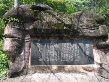 這塊巖石平整如盤。相傳,仙人常降臨這里對弈下棋。巖壁上刻的這兩個篆體字叫“奕臺”。“弈臺”邊上這搖搖欲墜的石頭,風吹石動,名曰:“飛來石”。巖壁上還有摩崖石刻“化極磐”三個字,帶有佛教語的味道,意思是:進入幻想中的靈變超脫境界。