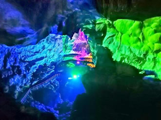 五更天: 前面“天際”出現(xiàn)魚肚白,邊上還有雄雞報(bào)曉石,接著,右前方洞頂閃爍著一顆啟明星。往前走,啟明星變成了半個(gè)月亮。在空氣濕度大、風(fēng)小、洞口外有陽(yáng)光的時(shí)候,半月旁還會(huì)出現(xiàn)一輪像彩虹一般的“佛光”。 |