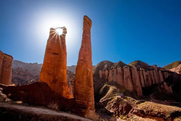 這是冰溝丹霞景區(qū)的又一標志性景觀。兩個并排而立的石柱,高約50米,它是由紫紅色砂巖、礫巖、夾砂礫巖構(gòu)成,在流水沖蝕及凍融風(fēng)化剝蝕等外動力作用下,沿著垂直節(jié)理崩塌、解體,使巖墻分割,形成兩個孤立的直徑不同的石柱,均上細下粗、上圓下方,說明風(fēng)化作用是自上而下進行的.石柱下方還基本保留原始節(jié)理切割地層后留下的棱角,形狀像一對逼真的男女生殖器官。左側(cè)的石柱為男柱,頂端如蘑菇;右側(cè)的石柱為女柱。