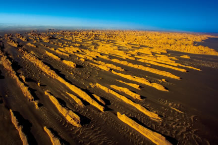 壟崗狀雅丹,分布在景區(qū)的西北部,南北斷續(xù)延伸可達(dá)上千米,寬5-30m。遠(yuǎn)遠(yuǎn)望去,規(guī)模宏大的雅丹猶如氣勢(shì)磅礴的遠(yuǎn)航艦隊(duì),在浩瀚無(wú)垠的漠海上劈波斬浪,蔚為壯觀。這種大規(guī)模集中連片的壟崗狀雅丹群在國(guó)內(nèi)外罕見(jiàn)。