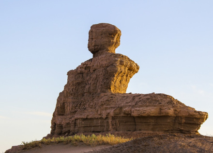 墻狀雅丹,屬于墻狀雅丹體向塔狀雅丹體的過(guò)渡類(lèi)型。雅丹體由沙質(zhì)和泥質(zhì)沉積物組成,差異侵蝕風(fēng)化作用形成了凹凸不平的表面。遠(yuǎn)遠(yuǎn)望去,酷似埃及的“獅身人面像”,充分展示了大自然的巧奪天工。