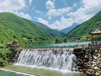尊敬的游客朋友,剛才我們欣賞了蔚然壯觀的石壁天河,馬上就要看到風韻萬千的白石山了。峰回路轉(zhuǎn),一道瀑流忽然從天而降,猶如一條銀龍從空中飛下,悠悠忽忽,晃晃蕩蕩,神態(tài)瀟灑自如。細看這條瀑布,它是從幾十丈高的山崖頂上落下的,自古只有水往低處流,而這里的山崖兩側溝內(nèi)無水,崖頂卻有瀑布,真是“水往高處流”。隨河風輕拂,它飄飄灑灑,飄逸而矯健,給人以無限聯(lián)想,“飛流直下三千尺,凝似銀河落九天”正是它的傳神寫照。潔白的瀑流擊在棱角突兀的巖石上,濺起串串晶瑩的珍珠,向四面八方飛散而去。道道涓涓細流,化成條條白龍,從巖石的四周蜿蜒游去。在官鵝溝眾多的瀑布中,九天飛瀑以它的凌空飛瀉,瀟灑自如而獨樹一幟。