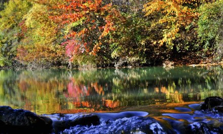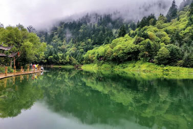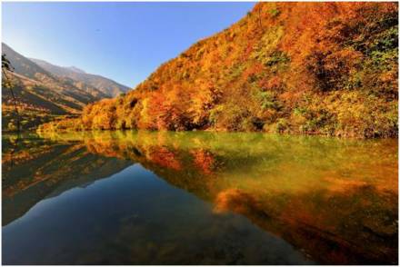 官鵝溝水美。13個大小不等、形態(tài)各異的湖泊,尤如一串綠色的珍珠鑲嵌在溝內(nèi),湖水清澈透底,隨湖底地貌高低呈不同顏色,那些倒映在湖中的古樹象一條條巨龍臥在湖底。藍天白云和青山古樹,映入湖中,使天地渾然一體,沒有界限。