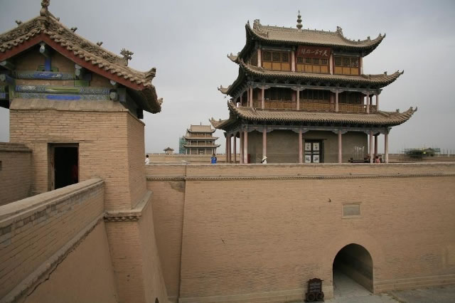 內(nèi)城四角有角樓,也叫“戍樓”,形如碉堡,是守城士兵值勤放哨的地方。南北城墻建有敵樓,是放置兵器的地方。站在這里回望,“光化樓”、“柔遠(yuǎn)樓”及“嘉峪關(guān)樓”三座高大建筑,同在一條中軸線上。這種“過洞式城門”及高臺(tái)樓閣建筑形式,是中國幾千年建筑歷史及建筑形式的延續(xù)發(fā)展。
