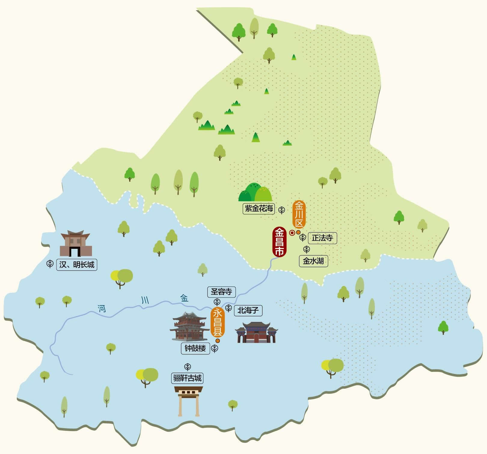 金昌—絲綢古道上的旅游新城,旅游資源獨具特色。有反映人類早期活動的二壩、三角城、鴛鴦池遺址;有以明代鐘鼓樓、北海子、武當山為重點的古建筑群,以圣容寺、云莊寺為代表的佛教文化圣地;有揭示古羅馬軍團千古之迷的驪靬古城遺址;境內(nèi)金川峽、皇城、西大河三大水庫風(fēng)景區(qū)是人們避暑休閑的理想去處。永昌景內(nèi)有天山積雪、云莊鋪翠、柳池漾月、金水潺潺、東崗?fù)碚、西嶺晴嵐、南峪龍騰、北山獅伏等景觀;巴丹吉林沙漠、鎳都“工業(yè)游”旅游資源,F(xiàn)代科技廣場、植物園、東湖景區(qū)等為新的旅游景點。金昌的民俗、節(jié)慶活動主要有農(nóng)歷四月初八的廟會,驪靬魚鱗陣,節(jié)子舞,古羅馬兵陣,斗獸表演,毛卜喇“萬”字燈。