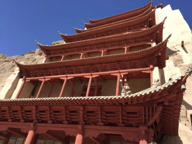 此上下三層洞窟似為吳和尚獨(dú)力開(kāi)鑿的系列窟。主室為莫高窟面積最大之洞窟。室內(nèi)馬蹄形中心佛壇上,存清代改修之宋塑九身,壇西沿背屏直接窟頂,繪唐及宋畫(huà)。四壁壁畫(huà)為重層,表層為西夏時(shí)所繪綠底千佛,色調(diào)單一,形象如出一模,缺乏生氣。1981年敦煌文物研究所整修此窟壁畫(huà)時(shí),曾發(fā)現(xiàn)底層晚唐壁畫(huà),該畫(huà)色彩鮮麗如新,線條清晰,似為某種經(jīng)變凈土說(shuō)法圖中的水榭雕欄,以此可窺未變色的晚唐畫(huà)之一斑?唔敒槲飨母∷苜N金的團(tuán)鳳四龍?jiān)寰呐麨橘N金棋格團(tuán)花圖案。甬道兩壁繪西夏說(shuō)法圖及供養(yǎng)菩薩,南壁中部嵌清代《重修千佛洞三層樓功德碑記》木碑一方,北壁中部為藏經(jīng)洞窟門(mén)。前室無(wú)畫(huà)。洞窟編號(hào)第16~17號(hào),16窟建于唐大中五年至咸通(851~867)間。窟前倚崖統(tǒng)建三層木構(gòu)窟檐,故俗稱(chēng)“三層樓”,為清光緒三十二年(1906年)王道士主持修建,王道士于16窟甬道北側(cè)發(fā)現(xiàn)藏經(jīng)洞,后編號(hào)為第17窟。因此三層樓也是為數(shù)不多的窟中窟。