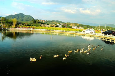 臺(tái)灣度假村位于長(zhǎng)潭旅游區(qū)入口處的虎形山,占地面積218畝,主要開(kāi)發(fā)廣場(chǎng)、朝圣區(qū)、游樂(lè)園、賓館、別墅、展覽館、科技城、美食一條街、農(nóng)業(yè)觀光和苗圃等項(xiàng)目。為一富娛樂(lè)性、知識(shí)性、觀賞性之休閑場(chǎng)所。1998年11月動(dòng)工,1999年,度假村建成戲水樂(lè)園、滑草坪、親子園地、世界蝴蝶館,此館擁有全國(guó)最多的蝴蝶種類,為廣東省最大最具規(guī)模的觀賞樂(lè)園。此外還成功引種臺(tái)灣名優(yōu)稀特水果火龍果。臺(tái)灣度假村風(fēng)光旖旎,富有詩(shī)情畫意,依山構(gòu)筑的山門別具一格,其景觀廣場(chǎng)、游樂(lè)園、朝圣區(qū)、科技城錯(cuò)落在山水、綠樹(shù)之間,水色塋潔,光可照人。