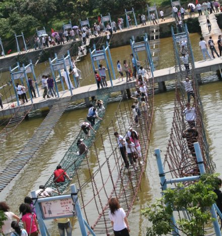 拓展訓(xùn)練基地占地面積10余畝,是深圳市青少年生存能力素質(zhì)教育基地,分為水上游樂(lè)區(qū)、高空拓展區(qū)與兒童游樂(lè)區(qū)。特別是水上游樂(lè)區(qū)涵蓋了霹靂滾桶、魔鬼車(chē)輪、木樁功夫橋和鐵鎖吊橋等有趣刺激拓展運(yùn)動(dòng)項(xiàng)目。您既可以在青山綠水中盡情呼吸新鮮空氣,又可以在動(dòng)感十足的拓展項(xiàng)目中挑戰(zhàn)自我,體驗(yàn)這一風(fēng)靡全球的拓展運(yùn)動(dòng)帶給你的無(wú)限快樂(lè)。項(xiàng)目網(wǎng)羅: 霹靂滾桶、魔鬼車(chē)輪、秋千橋 、連環(huán)獨(dú)木橋 、木樁功夫橋、 空中獨(dú)木橋、園木云梯橋、鐵鎖晃橋、長(zhǎng)板坡 、 云梯橋 、鐵鎖鋼絲橋 、天羅地網(wǎng)、云梯功夫橋 、鐵鎖吊橋、 木樁功夫橋、水上漂 、鐵鎖橋、 一線鐵鎖橋 一線鐵鎖橋 、九曲獨(dú)木橋 、踏水無(wú)痕 、向風(fēng)起舞 、鐵甲四強(qiáng)等。