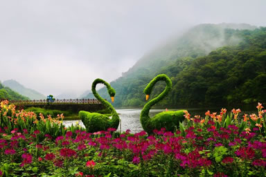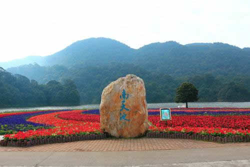 “七彩天池”花海是石灶風(fēng)光區(qū)的天池花海景點國慶期間的一個特色,由多種顏色的花卉共同組成。大紅色的一串紅、金黃色的硫化菊、紫色的千日紅、橙色的百日草、深紅色的紅穗冠、淡黃色的黃穗冠和粉色的朱唇等匯聚成一道亮麗的彩虹,降落在藍(lán)天碧水之間,創(chuàng)造出一個七彩斑斕的童話世界。同時,圍繞著這七色花海還有大波斯菊與醉蝶花。紅的,粉的,紫的,白的小花配以音樂等元素造型共同點綴著這幅優(yōu)美的畫卷。“七彩天池”最佳觀賞期為9-11月。