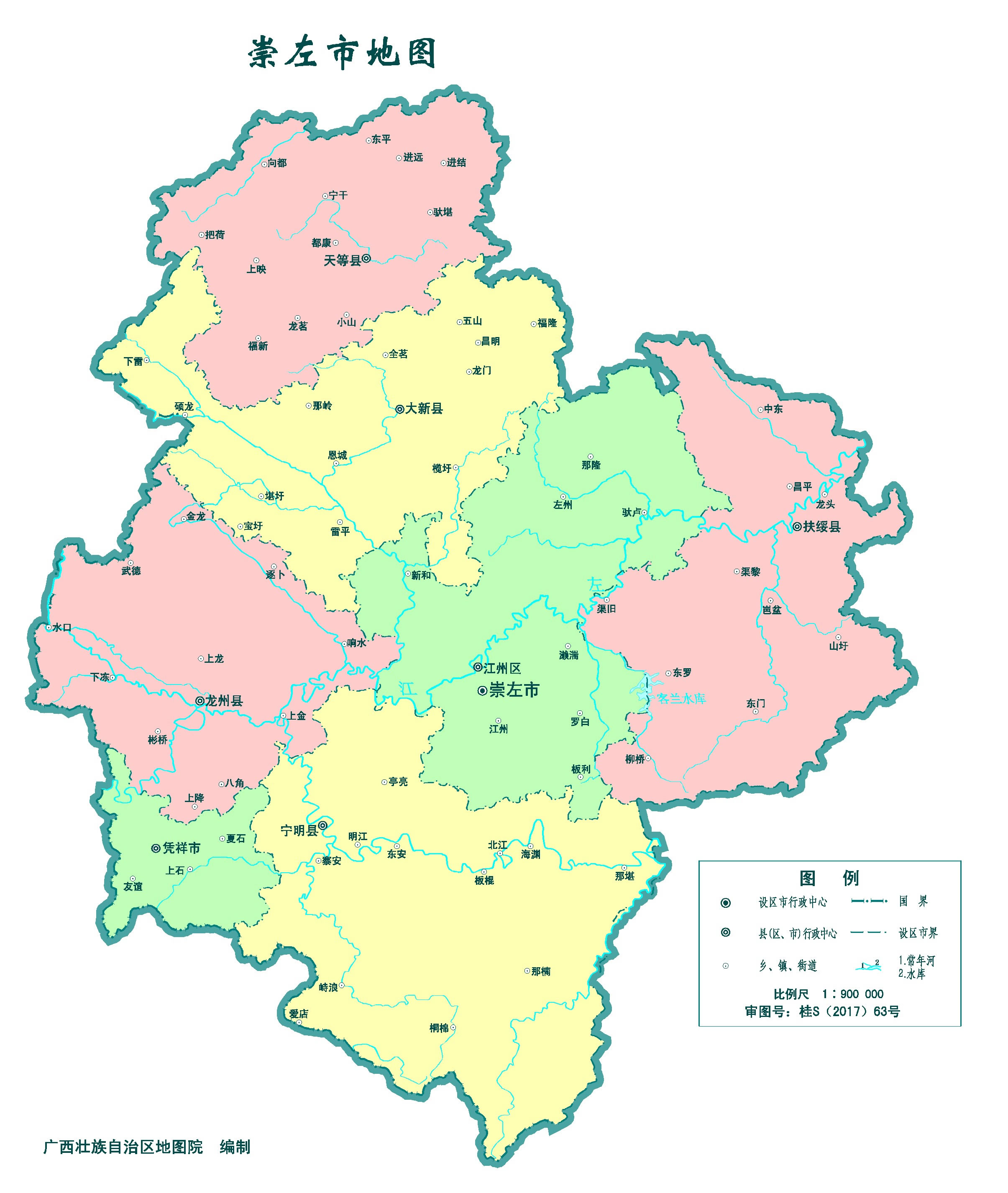 崇左市轄1個(gè)市轄區(qū)、5個(gè)縣,代管1個(gè)縣級(jí)市: