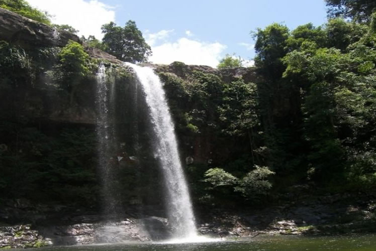 應天瀑布在十萬大山掃把山下,瑤寨念文屯西南3千米的山谷中。瀑布落山外,巖板稍平闊,水口呈“凹”狀,飛瀑處壁形,高28米,巖壁間有一凹處;深寬均數米,形似“水簾洞”。春夏大雨,山洪暴發(fā);瀑布響聲如雷,數里外還震人耳膜,“應天泉”由此而名。瀑下數十米,巨石如象;沉列溪中,同一溪流,距此瀑布約百米和二百米處,還有兩處小瀑布,高度均約十余米,當地人稱應天瀑布為“頭龍”,下面小瀑布為“二龍”和“三龍”。