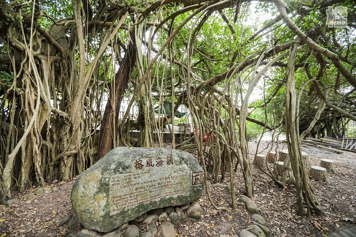 竹山古榕部落由一棵一千三百多年的古榕和眾多小葉榕組成。古榕為高山榕,榕樹高大挺拔,樹干需十三個成人張開雙臂才能合抱。而這一株株榕樹,也許是海風終年吹拂的緣故,榕樹長到一定高度后就橫向生長,長出許多氣根,氣根接觸地面后長成一根根枝干,這樣的氣根不知多少,數(shù)不勝數(shù),遠遠望去,一株榕樹就是一片樹林,在綠茵如水的野芋叢中,構(gòu)成了“頃地一古榕,飛瀑掛潭中”的佳景,打造了古榕部落“雙龍出海”、“四郎探母”、“六柱擎天”、“八仙會聚”以及榕樹瀑、榕樹墻、榕樹戀、榕樹侶等惟妙惟肖的生態(tài)奇觀。