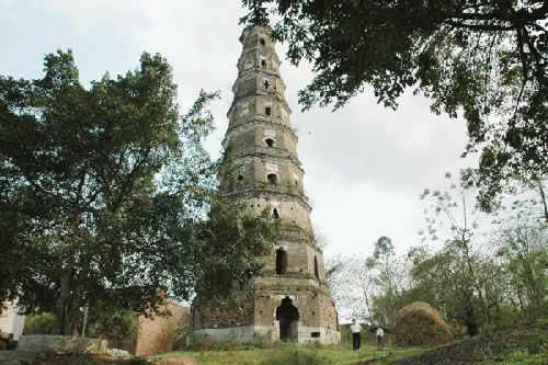 貴港市城東五里的羅泊灣,形如蘿卜,因而原名蘿卜灣。灣上有一座巍峨古塔,名曰安瀾,又曰漪瀾,塔高九層約30多米,底層周長36.62米,墻厚1.9米,塔身呈八角形,共有35個(gè)形狀不同的窗口,坐南向北臨江而立,建筑風(fēng)格非常獨(dú)特。此塔建于清嘉慶二十三年(1818),已經(jīng)有200多年。昔日登塔可望江城,江中百舸爭流,浪擊飛舟,城上高樓林立,車水馬龍,人來人往,無限風(fēng)光在塔峰。此塔遭受過無數(shù)次特大洪水的沖撞和雷電轟擊,仍巋然不動(dòng),穩(wěn)如泰山,塔頂?shù)耐咂坏袈,塔身沒有毀損,保留全貌。