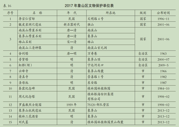 象山區(qū)有全國(guó)重點(diǎn)文物保護(hù)單位3個(gè),自治區(qū)級(jí)文物保護(hù)單位3個(gè),桂林市級(jí)文物保護(hù)單位9個(gè)。
