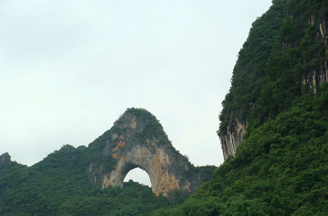 月亮山位于位于廣西壯族自治區(qū)桂林市陽朔縣十里畫廊景區(qū)末端。山頭上有一個(gè)天然的大石拱,兩面貫通,遠(yuǎn)看酷似天上明月高掛。從不同的角度變換觀看,此洞形狀也不斷變化。如果是開著車賞月山,那個(gè)石拱的形狀會(huì)從彎彎的上弦月,逐漸變成半月、圓月,繼而又變成下弦月。