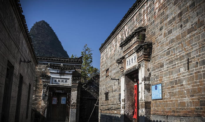 在明洪武年間,山東一位被貶的秦姓官員千里跋涉來到桂北地區(qū),據(jù)村民說,他們是唐代名將秦瓊的后人。后來秦氏的一支看中了水源頭村自周的山形地勢,于是選取了這個“風水寶地”落下根基。經(jīng)過多年繁衍,漸成規(guī)模。在后籠山下,依山勢拾級而建成了成片的大宅子,當?shù)厝朔Q其為“秦家大院”。這些宅子基本為三進三開,房屋分為四組,組與組間隔兩米,形成狹長的巷道,均以青石板鋪筑。宅子的高堂、戲院、花廳都敞開大門,兩旁房子的大門朝里開,很有意思。宅子的墻壁都以幾噸重的青石方墩為基,砌上1米多后,改用青磚砌至屋頂,很獨特。高大敞亮的上層樓房,窗戶上鑲嵌的窗花是琉璃瓦燒制而成,上面還畫著花卉,溫婉中透著古色古香。房中的板壁上刻著各種花紋的圖案,庭柱下的石礅上鑿有龍鳳的花飾,精細美觀。