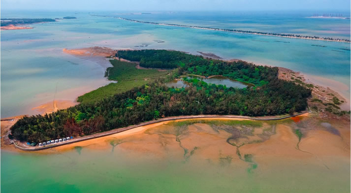 平山島,坐落在欽州城的南面,四面環(huán)水,與市區(qū)一水相隔土地平坦,林豐草茂,臨海的一面又突兀一座山峰,風(fēng)光旖旎,景色秀麗。康熙嶺標(biāo)準海堤,全長三十多千米, 號稱廣西第一堤,俗稱“海上長城”。