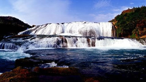 陡坡塘景區(qū)位于黃果樹瀑布上游1公里處,內有一座由鈣華灘壩形成的瀑頂寬105米,高21米,是黃果樹瀑布群中瀑頂最寬的瀑布。陡坡塘瀑布頂上是一個面積達1.5萬平方的巨大溶潭,瀑布則是形成在逶迤100多米長的鈣化灘壩上。每當洪水到來之前,瀑布都要發(fā)出“轟隆、轟隆”的吼聲,因此又叫“吼瀑”。