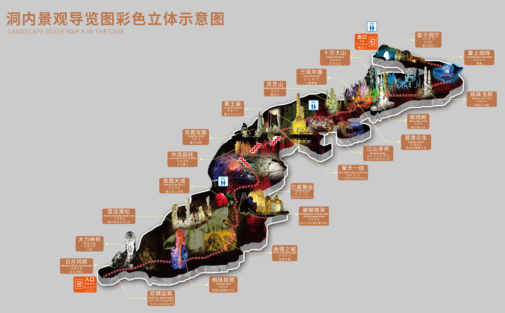全長一點一公里,面積五萬多平方米。分為漫谷長廊、北海隴、宴會大廳、江南澤國四部分!奥乳L廊”,洞廊深長、壁間鐘乳石奇異多姿!把鐣髲d”,面積一萬多平方米,洞內(nèi)平坦干燥,是游覽途中理想的休息、進餐和活動場所。“北海隴”,數(shù)條游龍似的邊石壩蜿蜒伸展,鐘乳石林立。中有一深潭,潭中有九根石筍,稱“清潭九筍”!敖蠞蓢,流水、湖泊、水塘、水田交錯,流水潺潺,田水如鏡。