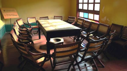 原為房主的小客廳。 會議室呈長方形,面積27平方米,室內(nèi)陳設,基本上是當年開會時的原貌。屋子正中的頂壁上懸掛著一盞荷葉邊蓋的洋員燈,屋子的東壁有一只掛鐘(原物)和兩個壁柜(原物),其中一個壁柜上嵌著一面穿衣鏡。西壁是一排軒亮的玻璃窗。屋子中央陳列著一張板栗色的長方桌(原物),四周圍著一圈木邊藤心摺疊靠背椅,共20只,為出席遵義會議的人員所坐。長方桌下有一只燒木炭的火盆,為當時取暖用。